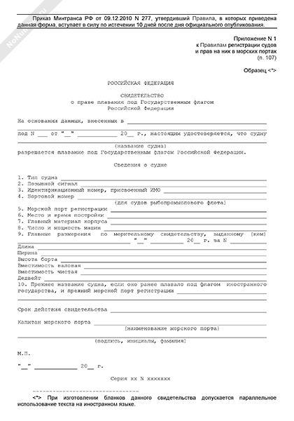 Свидетельство о праве плавания под Государственным флагом Российской Федерации (рекомендуемый образец заполнения)