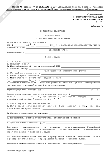 Свидетельство о регистрации ипотеки судна (рекомендуемый образец заполнения)