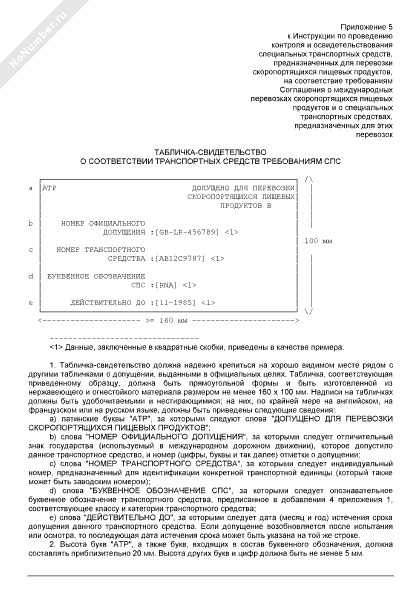 Табличка-свидетельство о соответствии транспортных средств требованиям соглашения о международных перевозках скоропортящихся пищевых продуктов и о специальных транспортных средствах, предназначенных для этих перевозок (рекомендуемый образец заполнения)