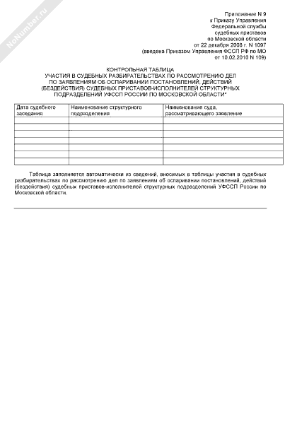 - 9Контрольная таблица участия в судебных разбирательствах по рассмотрению дел по заявлениям об оспаривании постановлений, действий (бездействия) судебных приставов-исполнителей структурных подразделений УФССП России по Московской области