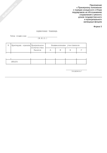 - 21Оценочная таблица участников конкурса на право заключения договора подряда на обслуживание жилых домов (форма № 5)