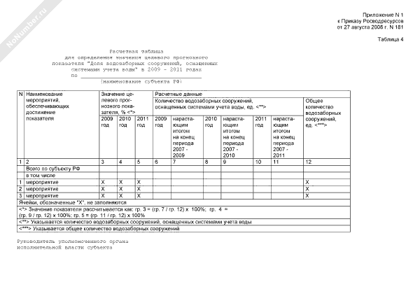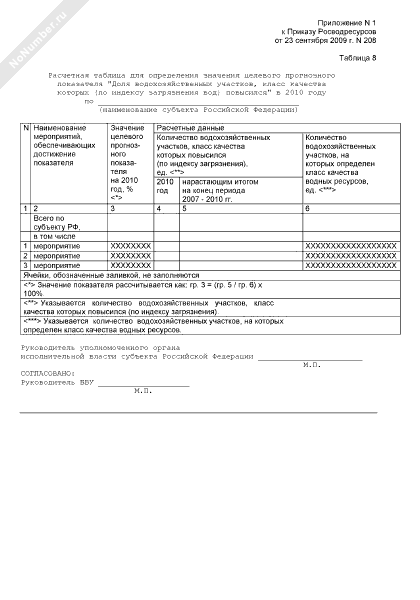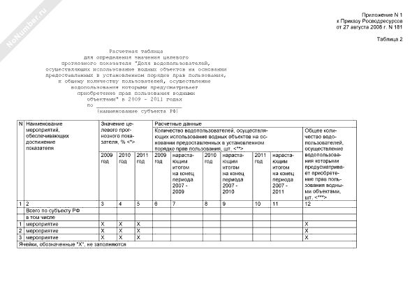 - 37Расчетная таблица для определения значения целевого прогнозного показателя «Доля водопользователей, осуществляющих использование водных объектов на основании предоставленных в установленном порядке прав пользования, к общему количеству пользователей, осуществление водопользования которыми предусматривает приобретение прав пользования водными объектами» в 2009–2011 годах