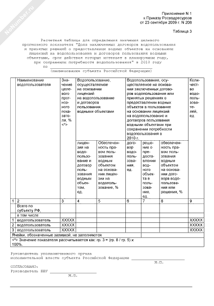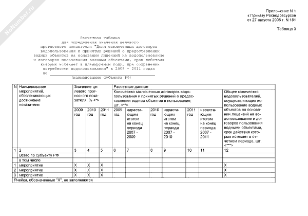 - 38Расчетная таблица для определения значения целевого прогнозного показателя «Доля заключенных договоров водопользования и принятых решений о предоставлении водных объектов на основании лицензий на водопользование и договоров пользования водными объектами, срок действия которых истекает в планируемом году, при сохранении потребности водопользования» в 2009–2011 годах