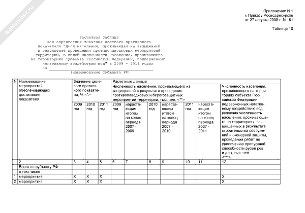 - 35Расчетная таблица для определения значения целевого прогнозного показателя «Доля населения, проживающая на защищенной в результате проведения противопаводковых мероприятий территории, в общей численности населения, проживающего на территориях субъекта Российской Федерации, подверженных негативному воздействию вод» в 2010 году
