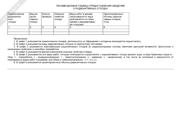 Рекомендуемая таблица предоставления сведений о радиоактивных отходах