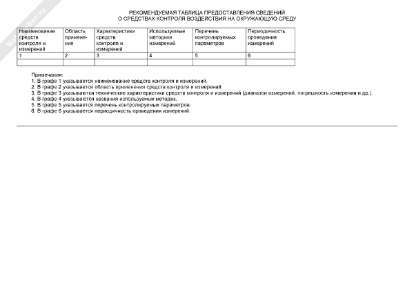 Рекомендуемая таблица предоставления сведений о средствах контроля воздействия на окружающую среду (рекомендуемый образец заполнения)