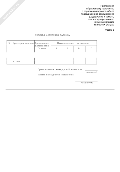 Сводная оценочная таблица участников конкурса на право заключения договора подряда на обслуживание жилых домов (форма № 6)