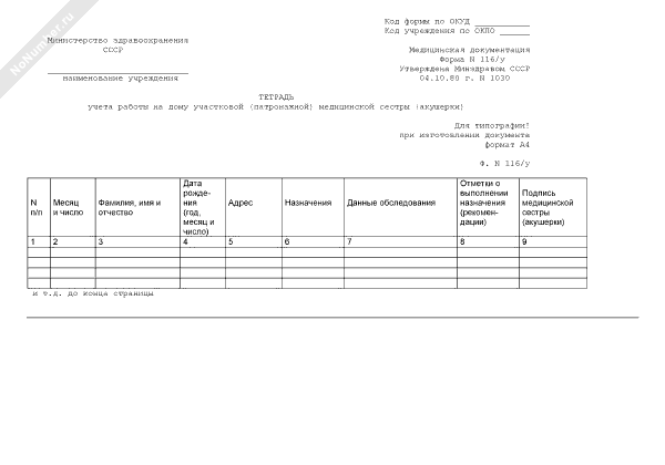 Тетрадь учета работы на дому участковой (патронажной) медицинской сестры (акушерки). Форма № 116/у