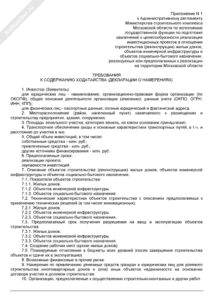 - 94Требования к содержанию ходатайства (декларации о намерениях) для получения заключения о целесообразности инвестиционного проекта в отношении строительства (реконструкции) жилых домов, объектов инженерной инфраструктуры и объектов социально-бытового назначения, реализуемых или предполагаемых к реализации на территории Московской области