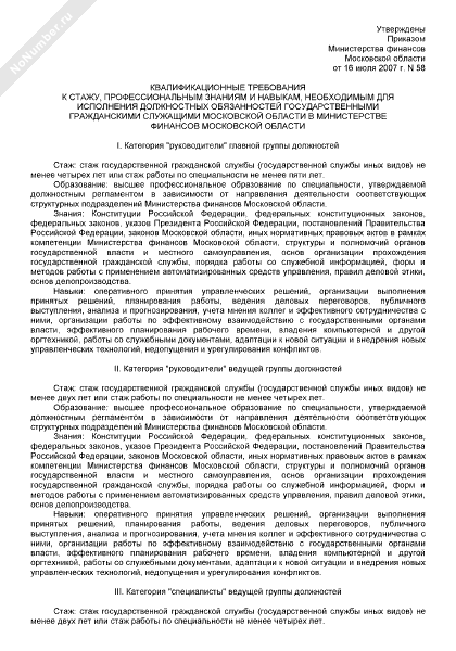 Квалификационные требования к стажу, профессиональным знаниям и навыкам, необходимым для исполнения должностных обязанностей государственными гражданскими служащими Московской области в Министерстве финансов Московской области (рекомендуемый образец заполнения)