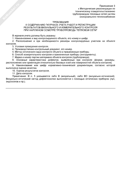 Требования к содержанию «Журнала учета работ и регистрации результатов визуального и измерительного контроля при наружном осмотре трубопровода тепловой сети» (рекомендуемый образец заполнения)