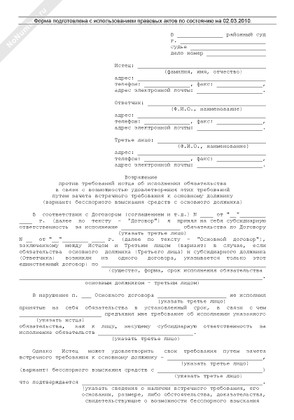 Возражение субсидиарного должника, представленное в суд общей юрисдикции, против требований кредитора в связи с возможностью удовлетворения требований кредитора путем зачета встречного требования к основному должнику либо бесспорного взыскания средств с основного должника (общая форма)