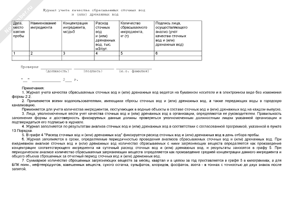- 15Учет качества сточных вод и (или) дренажных вод. Журнал учета качества сбрасываемых сточных вод и (или) дренажных вод. Форма № 2.2