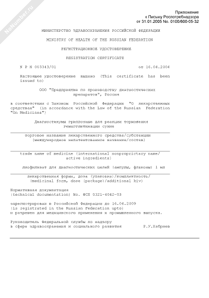 Регистрационное удостоверение. Диагностикумы гриппозные для реакции торможения гемагглютинации сухие (рус./англ.)