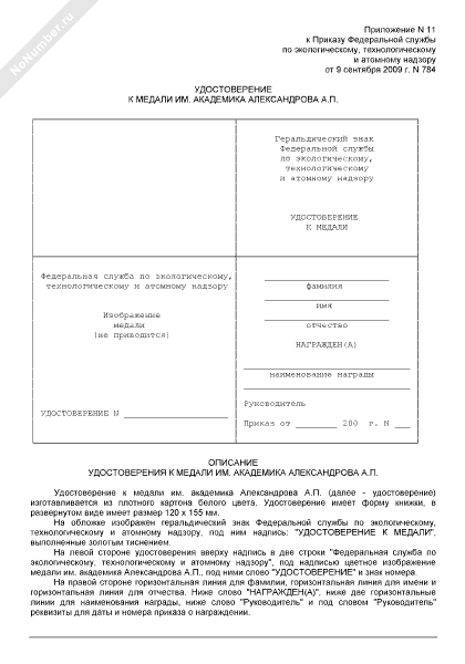Удостоверение к медали им. академика Александрова А.П. Федеральной службы по экологическому, технологическому и атомному надзору (рекомендуемый образец заполнения)