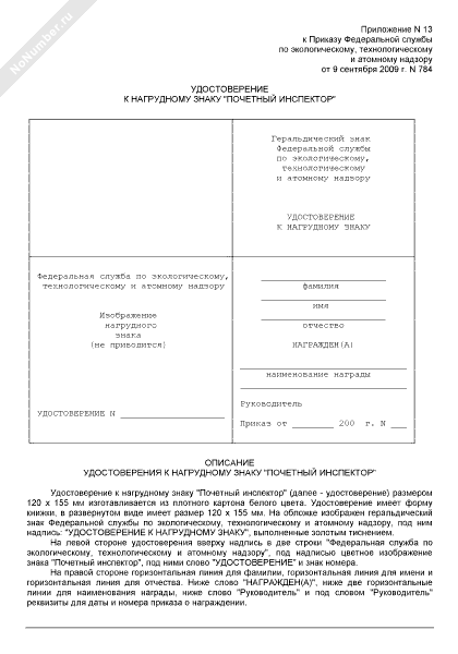 Удостоверение к нагрудному знаку «Почетный инспектор» Федеральной службы по экологическому, технологическому и атомному надзору (рекомендуемый образец заполнения)
