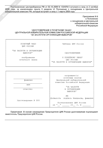 - Источник– Постановление Центризбиркома РФ от 02.10.2008 № 133/976-5 (редакция от 10.06.2009 № 163/1161-5)