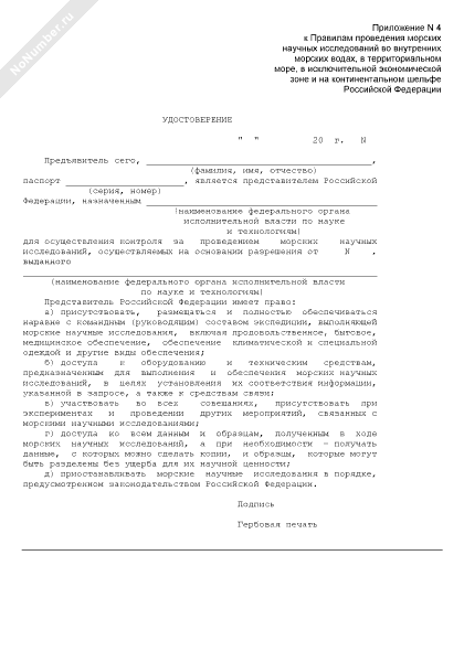 Удостоверение на право пересечения государственной границы Российской Федерации во время исполнения служебных обязанностей при проведении морских научных исследований во внутренних морских водах, в территориальном море, в исключительной экономической зоне и на континентальном шельфе Российской Федерации (рекомендуемый образец заполнения)
