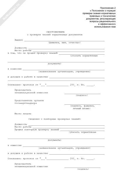 Удостоверение о проверке знаний нормативных правовых и технических документов, регулирующих вопросы рационального и эффективного использования газа (рекомендуемый образец заполнения)