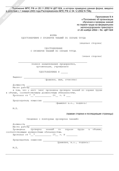 Удостоверение о проверке знаний по охране труда на федеральном железнодорожном транспорте (рекомендуемый образец заполнения)
