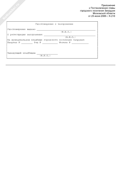 Удостоверение о захоронении на муниципальном кладбище городского поселения Запрудня Талдомского муниципального района Московской области (рекомендуемый образец заполнения)