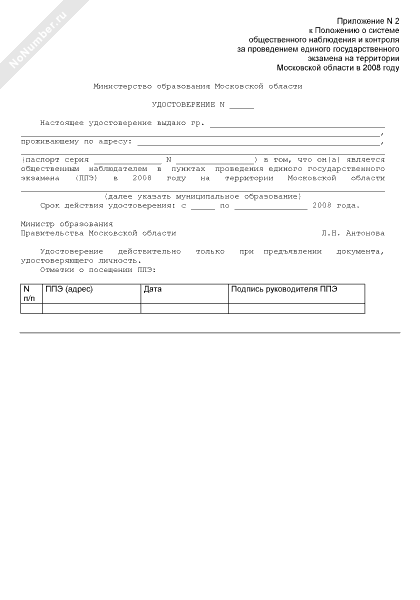 Удостоверение общественного наблюдателя за проведением единого государственного экзамена на территории Московской области, выданное Министерством образования Московской области (рекомендуемый образец заполнения)