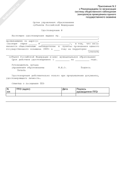 Удостоверение общественного наблюдателя за проведением единого государственного экзамена (рекомендуемый образец заполнения)