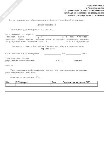 Удостоверение общественного наблюдателя за проведением единого государственного экзамена (рекомендуемый образец заполнения)