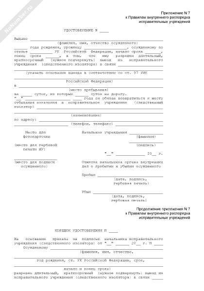 Удостоверение осужденному, получившему разрешение на длительный или краткосрочный выезд из исправительного учреждения (следственного изолятора)