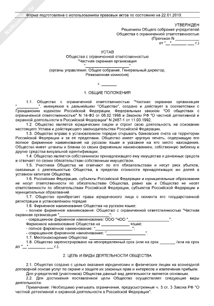 - 190Устав общества с ограниченной ответственностью частной охранной организации (органы управления: общее собрание, генеральный директор, ревизионная комиссия)
