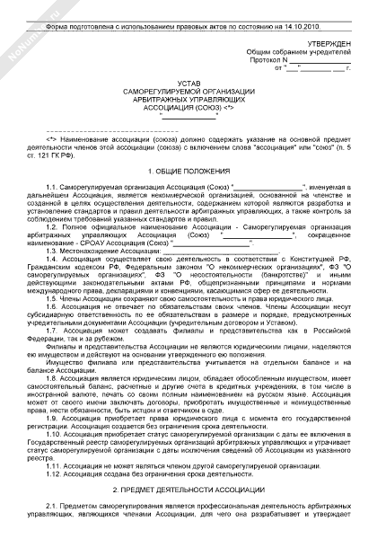 - 250Устав саморегулируемой организации арбитражных управляющих, созданной в форме ассоциации (союза)