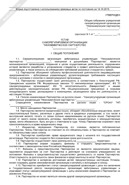 - 249Устав саморегулируемой организации арбитражных управляющих, созданной в форме некоммерческого партнерства (общая форма)