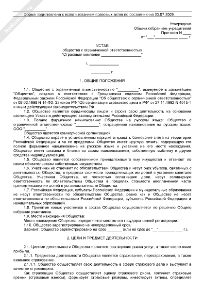 - 260Устав страховой компании (общество с ограниченной ответственностью, органы управления: общее собрание, генеральный директор)