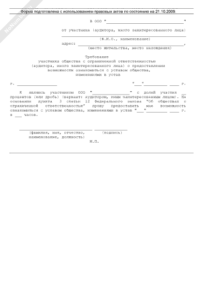 - 41Требование участника общества с ограниченной ответственностью (аудитора, иного заинтересованного лица) о предоставлении возможности ознакомиться с уставом общества, изменениями в устав