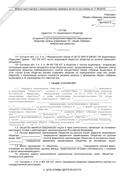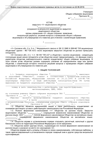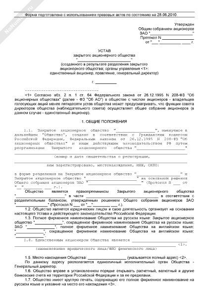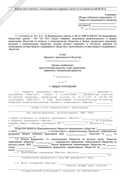 - 105Устав закрытого акционерного общества, созданного в результате разделения закрытого акционерного общества (органы управления: единственный акционер, правление, генеральный директор)