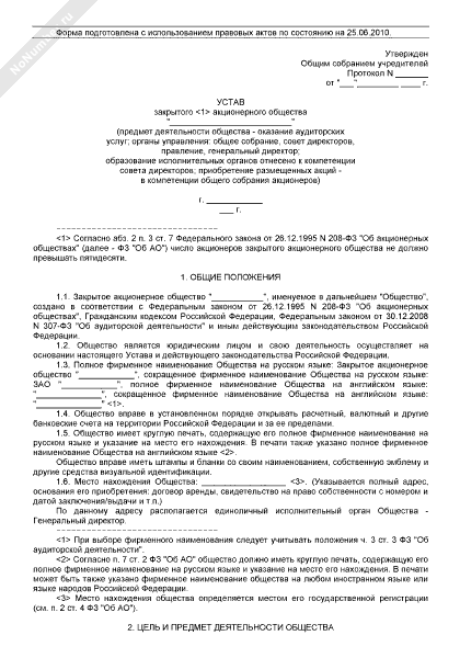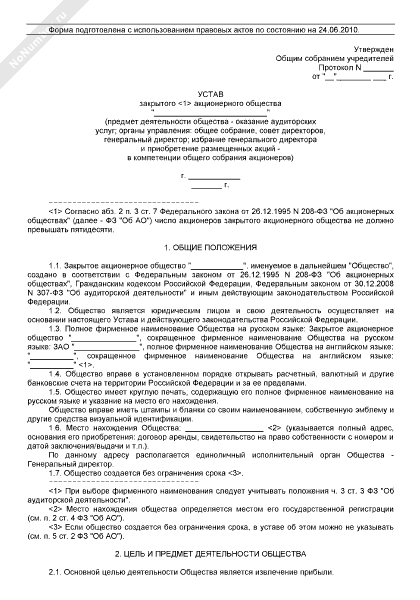 - 110Устав закрытого акционерного общества (предмет деятельности общества — оказание аудиторских услуг; органы управления: общее собрание, совет директоров, правление, генеральный директор; избрание генерального директора и правления отнесено к компетенции совета директоров; приобретение размещенных акций — в компетенции общего собрания)