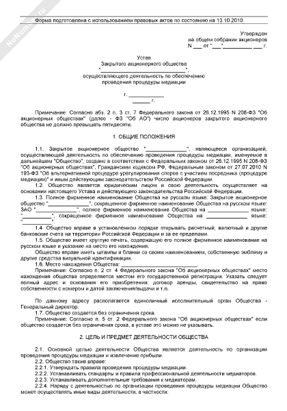 - 119Устав закрытого акционерного общества — организации, осуществляющей деятельность по обеспечению проведения процедуры медиации