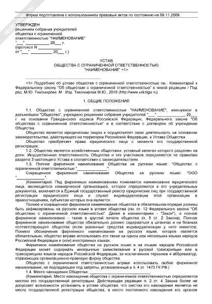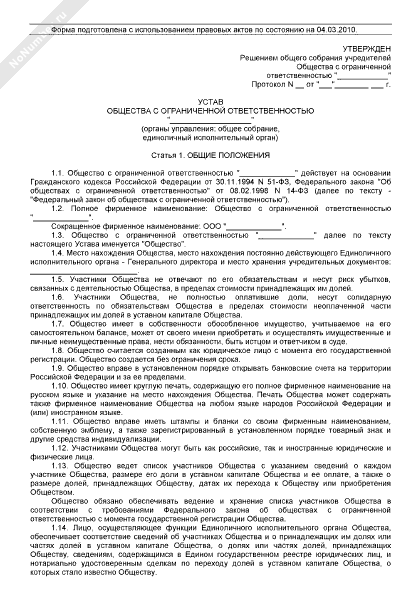 Устав общества с ограниченной ответственностью с двумя участниками (органы управления: общее собрание, единоличный исполнительный орган)