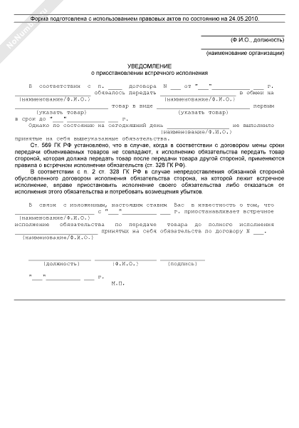 - 181Уведомление лица, не исполнившего обусловленное договором мены обязательство первым передать обмениваемый товар, о приостановлении встречного исполнения