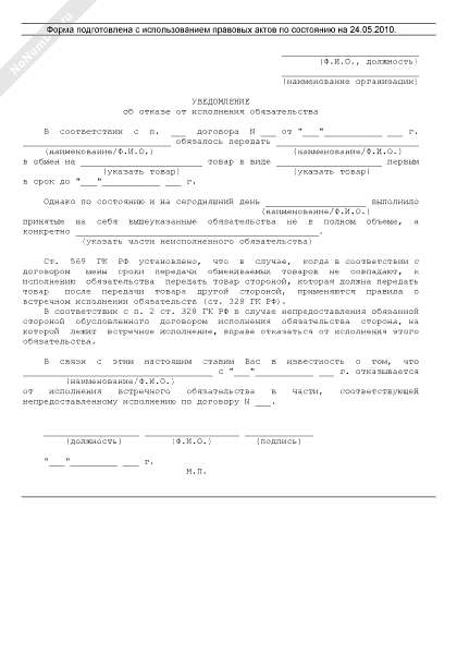 - 182Уведомление лица, частично не исполнившего обусловленное договором мены обязательство первым передать обмениваемый товар, об отказе от исполнения в части, соответствующей непредоставленному исполнению