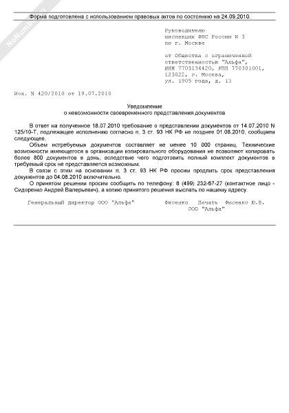 - 196Уведомление налогового органа о невозможности своевременного представления документов
