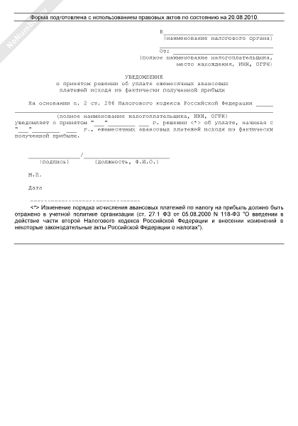 - 194Уведомление налогового органа о принятом решении об уплате ежемесячных авансовых платежей исходя из фактически полученной прибыли