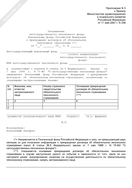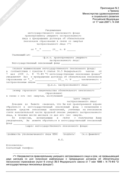 - 198Уведомление негосударственного пенсионного фонда правопреемнику умершего застрахованного лица о прекращении договора об обязательном пенсионном страховании в связи со смертью застрахованного лица