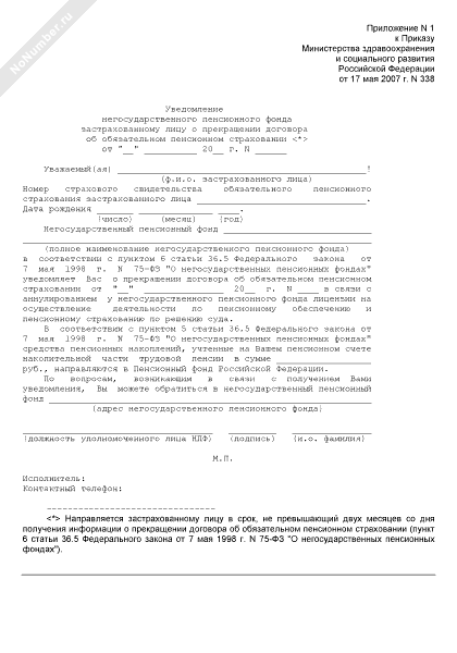 - 197Уведомление негосударственного пенсионного фонда застрахованному лицу о прекращении договора об обязательном пенсионном страховании