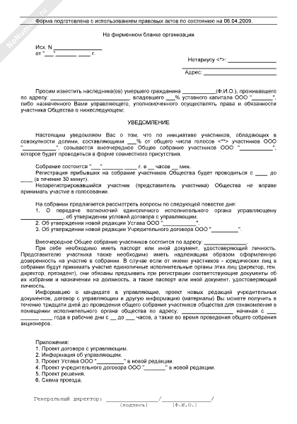 - 200Уведомление нотариусу о проведении внеочередного общего собрания участников общества с ограниченной ответственностью как лицу, обладающему полномочиями обеспечить уведомление лица, имеющего право осуществлять права умершего участника общества до принятия наследником умершего доли в качестве наследства
