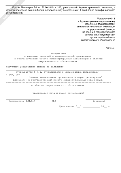 - 311Уведомление о внесении сведений о некоммерческой организации в государственный реестр саморегулируемых организаций в области энергетического обследования