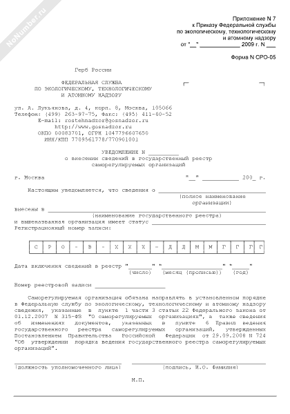 - 303Уведомление о внесении сведений в государственный реестр саморегулируемых организаций. Форма № СРО-05