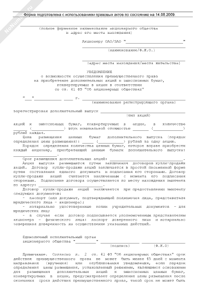 - 305Уведомление о возможности осуществления преимущественного права на приобретение дополнительных акций и эмиссионных бумаг, конвертируемых в акции в соответствии со ст. 41 ФЗ «Об акционерных обществах»