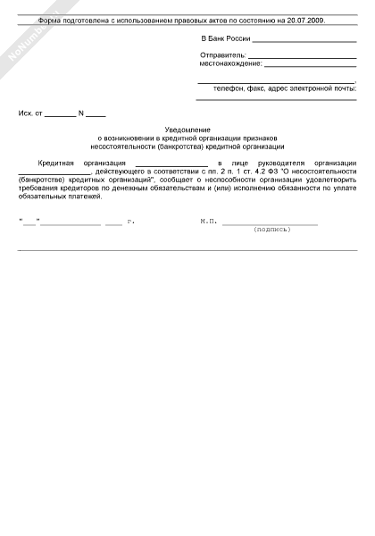 - 307Уведомление о возникновении в кредитной организации признаков несостоятельности (банкротства) кредитной организации
