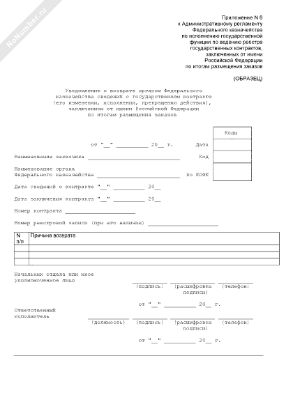 - 315Уведомление о возврате органом Федерального казначейства сведений о государственном контракте (его изменении, исполнении, прекращении действия), заключенном от имени Российской Федерации по итогам размещения заказов